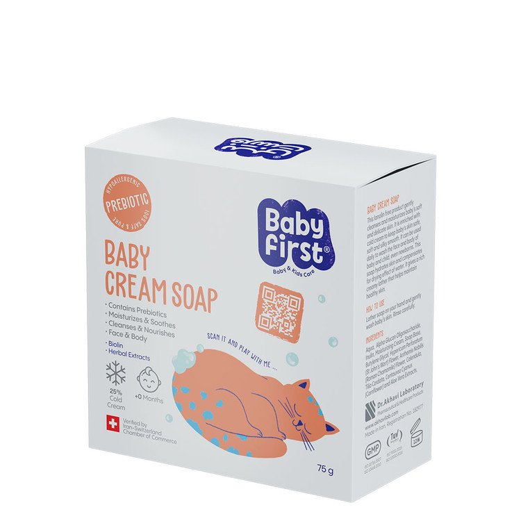 صابون بچه کرمی بیبی فرست یک محصول پاک کننده ملایم و سازگار با پوست کودکان و نوزادان است که ضمن رفع آلودگی ها، در رطوبت رسانی به پوست نیز موثر واقع گردیده است. صابون بچه کرمی بیبی فرست حاوی 15 درصد کرم مرطوب کننده بوده و مانع از بروز خشکی و احساس کشیدگی روی پوست پس از شستشو می گردد. فرمولاسیون این محصول حاوی ترکیبات پری بیوتیک می باشد در نتیجه سد دفاعی پوست کودک را به خوبی تقویت می نماید.